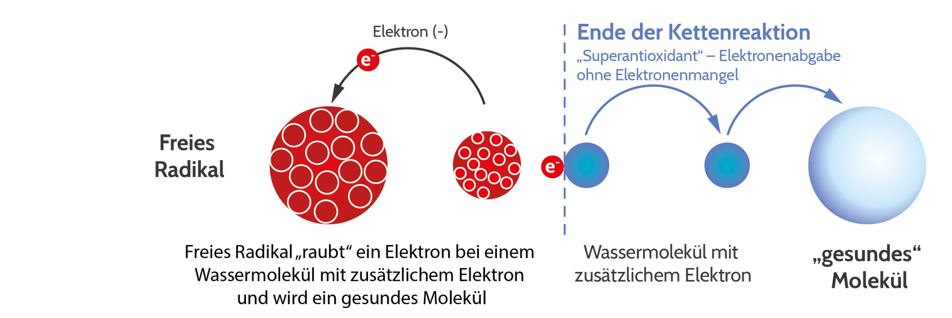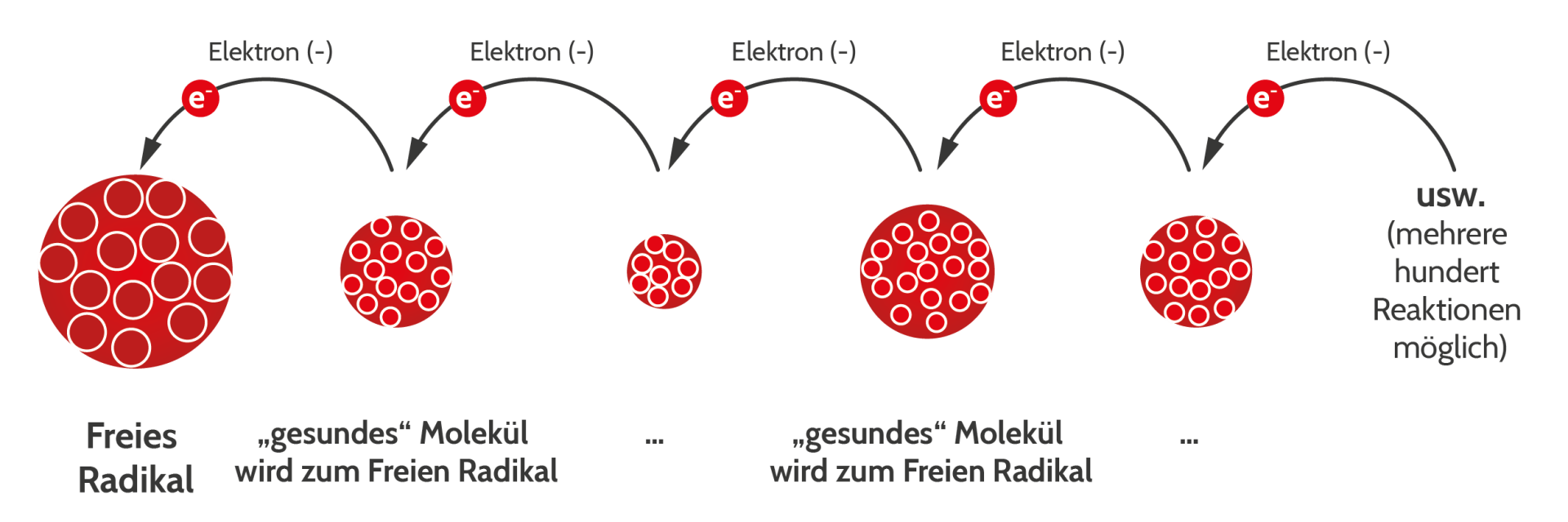Im Normalzustand befinden sich Moleküle in einem neutralen Zustand, bei dem die positiven und negativen Ladungen ausgeglichen – in Balance – sind. Durch äußere Einwirkungen wie Sonnenstrahlen, Giftstoffe und Stress, aber auch durch die Reaktion mit einem Freien Radikal verliert das Molekül etwas von seiner negativen Ladung. Es gerät in Ungleichgewicht und versucht dieses sofort wieder auszugleichen. Dadurch wird dieses Molekül selbst zum Freien Radikal und sucht nach einem Elektron bei einem anderen Molekül, um diesen Mangel wieder auszugleichen.