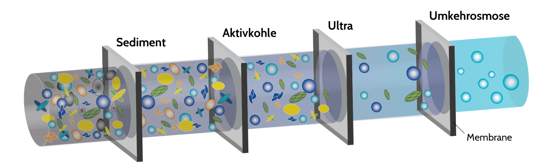 Das Wasser wird von groben Schwebteilchen befreit. Bekannt hierfür sind Tisch- oder Kannenfilter, bei denen man alle 4 Wochen die Kartuschen wechseln muss.